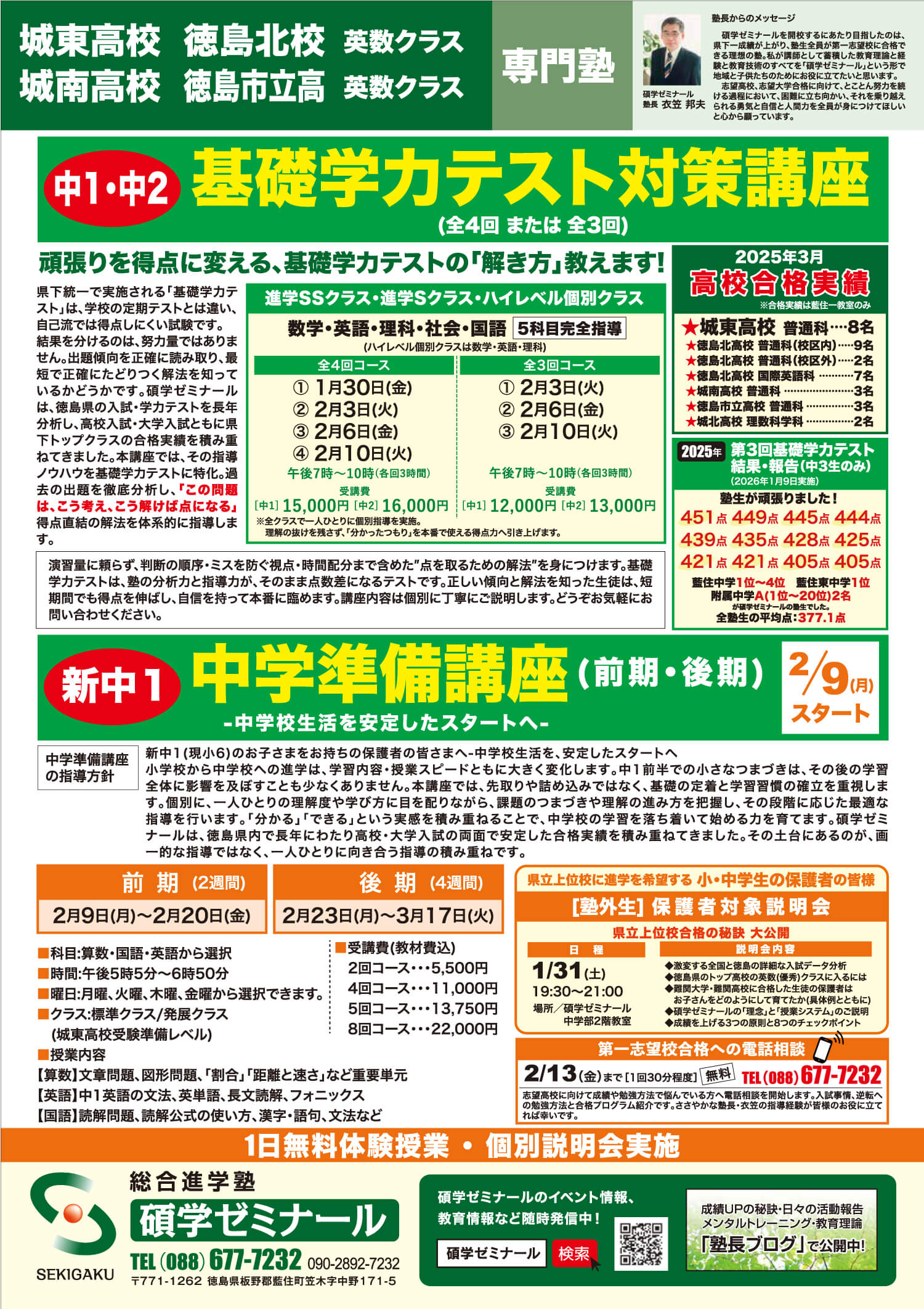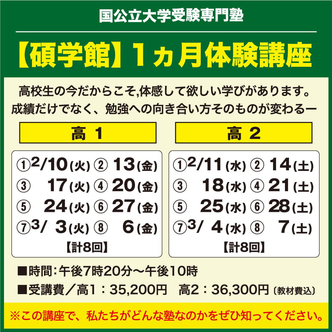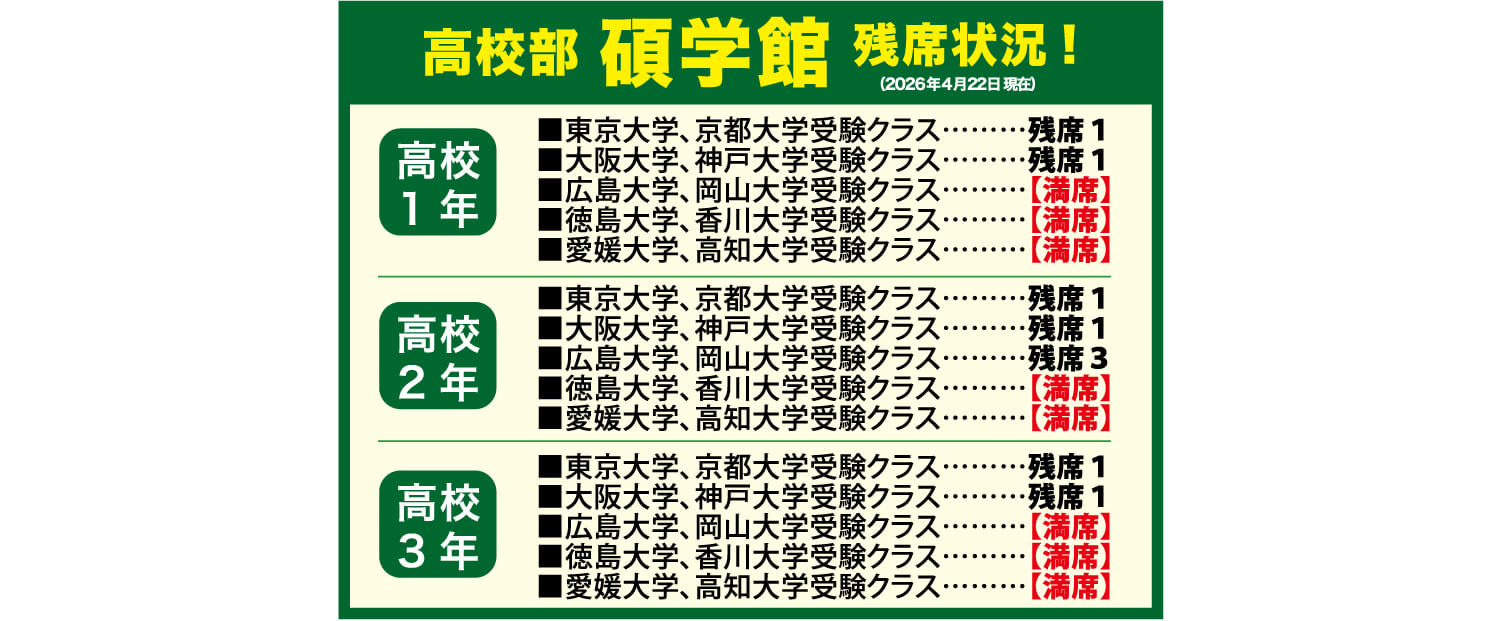 最新の受験技術を導入し、碩学ゼミナールの伝統そのままに人間を鍛えて「成長」を支える!個別面談・カウンセリング・メンタルトレーニングも実施。「英語」「数学」の超基礎(中学生範囲)から徹底指導で最低50点アップを目ざす。また、物理・化学、センター国語、2次試験の国語対策など、志望校別クラス編成で、志望大学合格に必要な全てを揃えています。