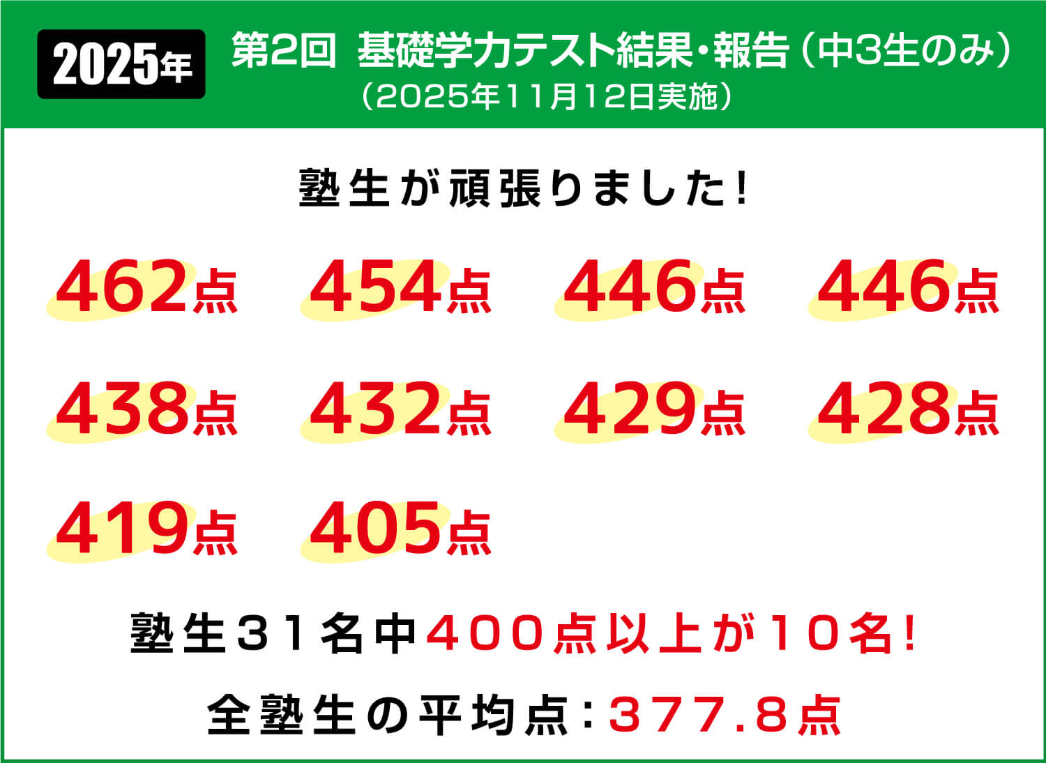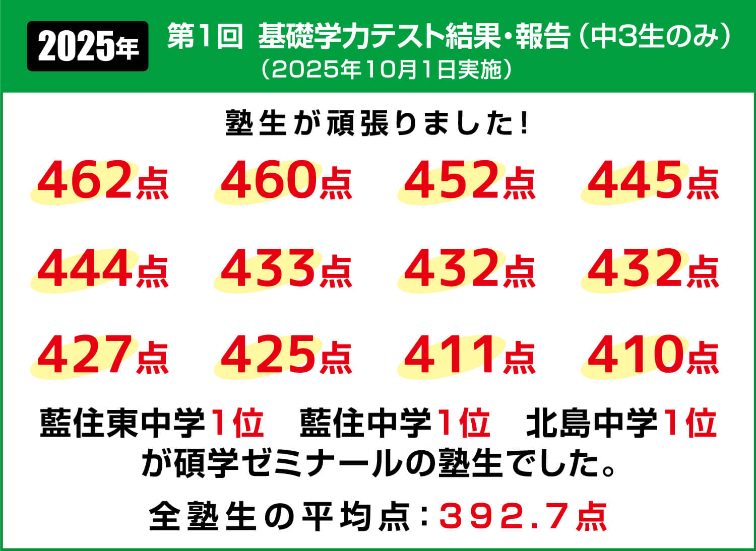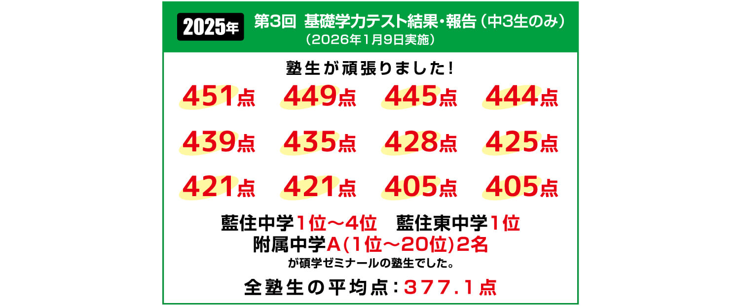 基礎学力テスト・実力テスト・その他すべてのテストで5科目500点満点を実現できる指導体制を備えています。成績学年トップから勉強の苦手な生徒まで、すべての塾生の最高の指導が行えるように最大学年6クラス分けを実施。第一志望校「大逆転合格クラス」など、現在の自分の実力に合わせて、最適なクラスを選べます。また、ベテラン講師が常に子どもたちに寄り添い、誠心誠意生徒の心に届く指導を行っています。